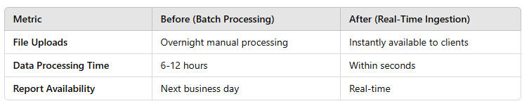 The uploaded data was instantly processed, validated, and converted into reports in real time, reducing the risk of delayed discrepancy detection.