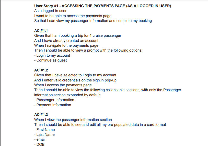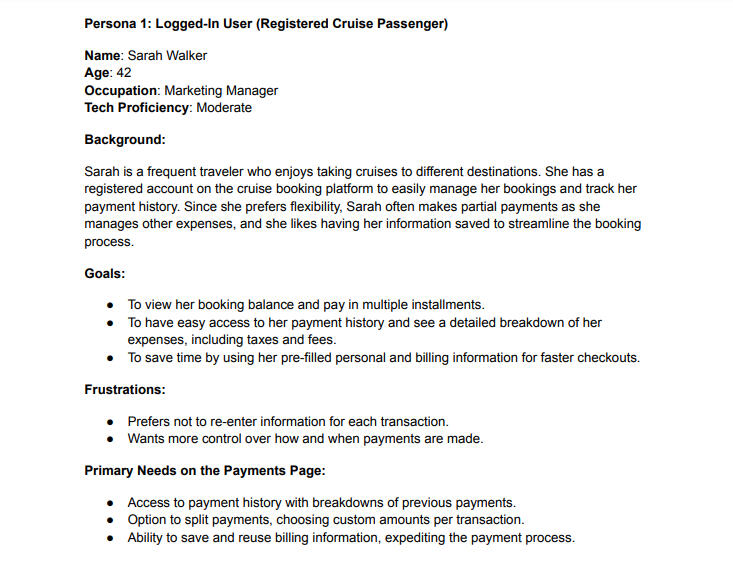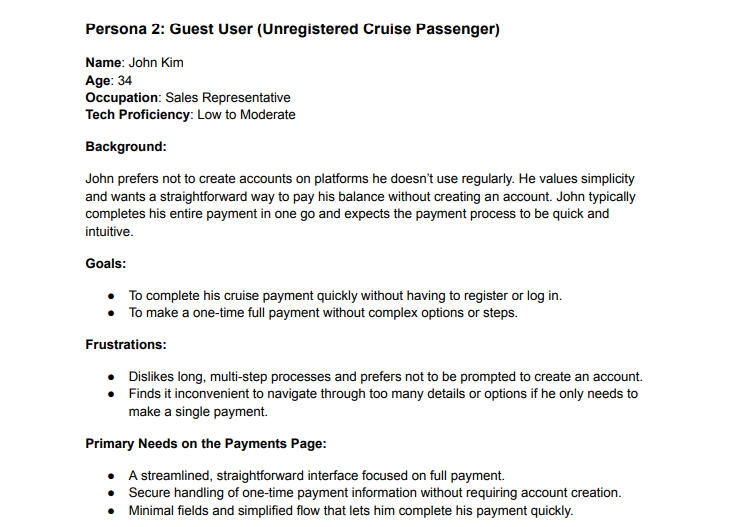 The Payments Page redesign successfully modernized and streamlined the payment experience for cruise travelers. By applying benchmarking insights, process optimization techniques, and API integrations, the solution reduced customer support dependency while improving payment flexibility and security.This project demonstrated my ability to leverage research-driven insights to improve product functionality, and translate business challenges into structured technical requirements.